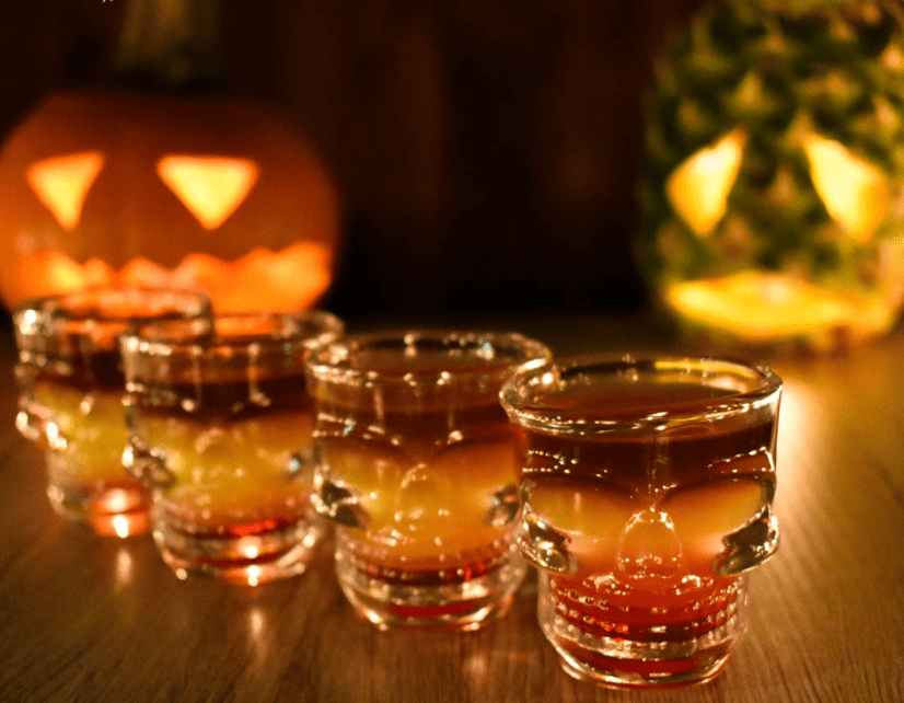 Трехслойный коктейль к Хэллоуину с Jagermeister с гренадиновой сладостью и освежающим апельсиновым соком. Фото отлично вписываются в тему Хэллоуина.
