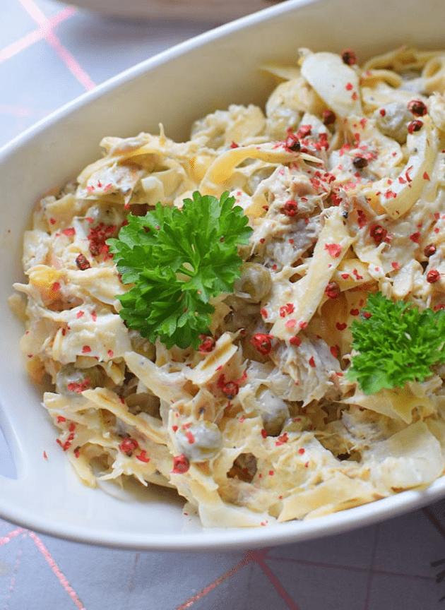 В этом салате с копченой скумбрией, помимо одноименного ингредиента, копченой скумбрии, вы также найдете лук и зеленый горошек.