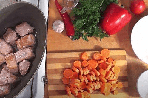 Баранину и курдючное сало заливаем холодной водой, доводим до кипения. Снимаем пену и варим до полуготовности на небольшом огне 40-50 минут.