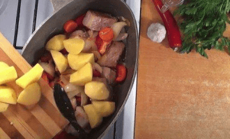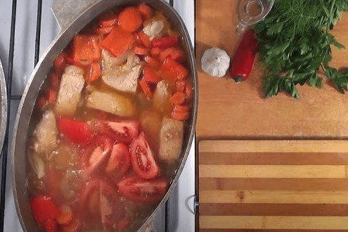 Прибавляем в бульон подготовленные овощи и нарезанные соломкой помидоры или томат-пюре. Солим, перчим, добавляем специи.